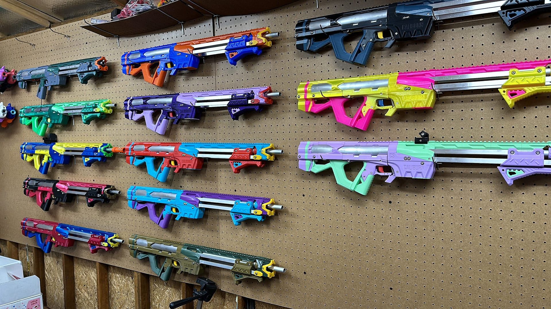This is not your little brother’s nerf blaster. This is a high-powered foam dart blaster that can shoot up to 260 feet per second (fps) which really packs a punch. It is suitable for kids from 14 and up. We have a weaker spring option as well for the younger kids which makes it easier to prime and hurts a lot less when shot.